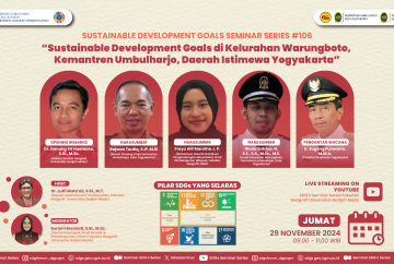 Departemen Geografi Pembangunan, Fakultas Geografi, UGM telah menyelenggarakan SDGs Seminar Series yang ke #106 pada tanggal 29 November 2024. Adapun tema yang diusung adalah “Sustainable Development Goals di Kelurahan Warungboto, ...