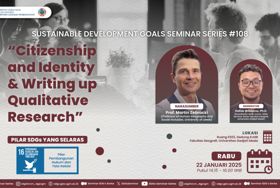 Departemen Geografi Pembangunan, Fakultas Geografi, UGM telah menyelenggarakan SDGs Seminar Series yang ke #108 pada tanggal 22 Januari 2025. Adapun tema yang diusung adalah “Citizenship and Identity & Writing up Qualitative ...