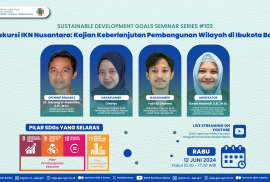 Departemen Geografi Pembangunan, Fakultas Geografi, UGM telah menyelenggarakan SDGs Seminar Series yang ke #102 pada tanggal 12 Juni 2024. Adapun tema yang diusung adalah “Ekskursi IKN Nusantara: Kajian Keberlanjutan Pembangunan Wilayah di Ibukota Baru”. Hal ini selaras dengan pilar yang diusung dalam SDGs, yakni pilar pembangunan ekonomi berupa tujuan ke-8 “Pekerjaan Layak dan Pertumbuhan Ekonomi”, tujuan ke-9 ‘‘Infrastruktur, Industri, dan Inovasi”, serta tujuan ke-10 “Mengurangi Ketimpangan”. Selain itu, tema ini juga selaras dengan pilar pembangunan lingkungan berupa tujuan ke-11 “Kota dan Komunitas yang Berkelanjutan”. Seminar kali ini dikemas secara menarik melalui rangkain talkshow bersama dua Mahasiswa Pembangunan Wilayah, Fakultas Gegorafi UGM Angkatan 2021 yaitu Cherlys dan Fajri Aji Dharma. Seri menarik kali ini merupakan sharing pemaparan terkait hasil dari Kuliah Kerja Lapangan 3 yang dilakukan oleh mahasiswa program studi Pembangunan Wilayah angkatan 2021 di Ibu Kota Nusantara, Kalimantan Timur.