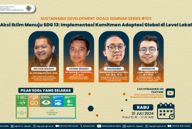 Departemen Geografi Pembangunan, Fakultas Geografi, UGM telah menyelenggarakan SDGs Seminar Series yang ke #103 pada tanggal 31 Juli 2024. Adapun tema yang diusung adalah “Aksi Iklim Menuju SDG 13: Implementasi Komitmen Adaptasi Global di Level Lokal”. Hal ini selaras dengan pilar yang diusung dalam SDGs, yakni pilar pembangunan sosial berupa tujuan ke-3 “Kesehatan yang Baik dan Kesejahteraan”. Selain itu, tema ini juga selaras dengan pilar pembangunan lingkungan berupa tujuan ke-12 “Konsumsi dan Produksi yang Bertanggung Jawab”, tujuan ke-13 “Penanganan Perubahan Iklim”, tujuan ke-14 “Menjaga Ekosistem Laut”, serta tujuan ke-15 “Menjaga Ekosistem Darat”. Narasumber Bapak Stanislaus Risadi Apresian, S.IP., M.A., Ph.D. yang merupakan Postgraduate Researcher School of Politics and International Studies, University of Leeds pada seri menarik kali ini membahas terkait dinamika pelaksanaan proses-proses mitigasi dan adaptasi perubahan iklim yang terjadi di Indonesia.