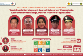Departemen Geografi Pembangunan, Fakultas Geografi, UGM telah menyelenggarakan SDGs Seminar Series yang ke #106 pada tanggal 29 November 2024. Adapun tema yang diusung adalah “Sustainable Development Goals di Kelurahan Warungboto, Kemantren Umbulharjo, Daerah Istimewa Yogyakarta”. Hal ini selaras dengan pilar yang diusung dalam SDGs, yakni pilar pembangunan sosial berupa tujuan ke-3 “Kesehatan yang Baik dan Kesejahteraan” dan tujuan ke-5 “Kesetaraan Gender”, serta pilar pembangunan lingkungan berupa tujuan ke-11 “Kota dan Komunitas yang Berkelanjutan”, tujuan ke-12 “Konsumsi dan Produksi yang Bertanggung Jawab”, dan tujuan ke-15 “Menjaga Ekosistem Darat”. Selain itu, seminar seri kali juga selaras dengan pilar hukum dan tata kelola berupa tujuan ke-16 “Perdamaian Keadilan, dan Kelembagaan yang Kuat” serta tujuan ke-17 “Kemitraan untuk Mencapai Tujuan” . Seminar kali ini menjadi kesempatan spesial karena memaparkan hasil implementasi SDGs secara operasional pada tingkat mendasar di Kelurahan Warungboto bersama dengan tiga narasumber yaitu Bapak Rajwan Taufiq, Bapak Weda Satriya dan Freya Alif Maretha Joda Putri. Seminar ini semakin spesial dengan kehadiran Bapak Sugeng Purwanto, Penjabat Wali Kota Yogyakarta sebagai pengantar wacana.