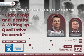 Departemen Geografi Pembangunan, Fakultas Geografi, UGM telah menyelenggarakan SDGs Seminar Series yang ke #108 pada tanggal 22 Januari 2025. Adapun tema yang diusung adalah “Citizenship and Identity & Writing up Qualitative Research”. Hal ini selaras dengan pilar yang diusung dalam SDGs, yakni pilar pembangunan hukum dan tata kelola tujuan ke-16 “Perdamaian Keadilan, dan Kelembagaan yang Kuat”. Seminar dilaksanakan secara luring di Gedung KLMB, Fakultas Geografi, Universitas Gadjah Mada serta dilaksanakan secara daring menggunakan media Zoom meeting, live YouTube, dan live report story Instagram. Pembicara pada seri kali ini adalah Prof. Martin Zebracki (Professor of Human Geography and Social inclusion, University of Leeds). Moderator seminar ini adalah Bapak Hafidz Wibisono, S.T., M.T., Ph.D. (Koordinator SDGs Forum-SDGs Seminar Series Fakultas Geografi. Universitas Gadjah Mada).